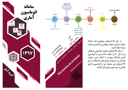 گروه آمار مدیریت آمارو فنآوری اطلاعات و ارتباطات دانشگاه علوم پزشکی مشهد با تکیه بر دانش ، تجربه ، نیروی انسانی و اطلاعات موجود در سازمان، همواره توانسته است اقدامات نوآورانه ای در جهت افزایش کارآیی و جایگاه گروه آمار داشته باشد.