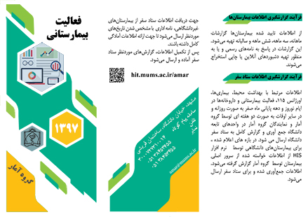 http://hit.mums.ac.ir/index.php/website/test/statictic-office/intro-statistic برای دریافت اطلاعات از بیمارستانها فرمهای اطلاعات بستری، پاراکلینیک، درمانگاه سرپائی، اورژانس، انواع بیمه ، پیراپزشکان ، تعداد جراحیها و سایر موارد از جمله داروخانه و ... طراحی گردیده که طی فرآیند مشخصی تکمیل میگردد.