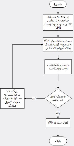 * مراجعه به مسئول فناوری اطلاعات واحد مربوطه و درخواست فعال سازی VPN، اعلام نام کاربری، کد ملی جهت درخواستهای دسترسی به صورت محدود. *اعلام نام کاربری و کد ملی به همراه تکمیل فرم تاییدیه جهت کاربران با دسترسی خاص |