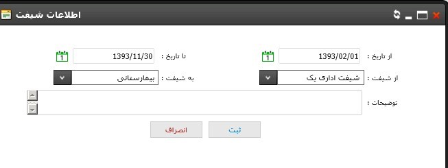 شیفت کمکی برای پرسنلی قابل استفاده است که بنا به دلایلی تصمیم به تغییر شیفت آنها گرفته می شود.گاهی ممکن است بنا به دلایل متعددی چون تغییرات در بخش یا تغییر ساعت کار پرسنل تصمیم به تعویض شیفت شخص می نمایید برای مثال از شیفت بیمارستانی به شیفت اداری و یا سایر انواع شیفت ها. در این صورت مراحل زیر را جهت نگهداری سابقه نوع شیفت پرسنل ثبت می کنید تا درصورت باز بینی و یا محاسبه مجدد برای فرد این بازه تاریخی برایش مطابق با شیفت قبلی خود حساب شود. برای این منظور مراحل زیر قابل توضیح می باشد.