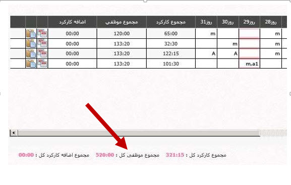 نمایش میزان مجموع کارکرد و موظفی و اضافه کار پرسنل در انتهای شیفت دیوتی آنها و همچنین نمایش مجموع کارکرد و موظفی و اضافه کار کل پرسنل در انتهای صفحه در "تعریف شیفت سالیانه"