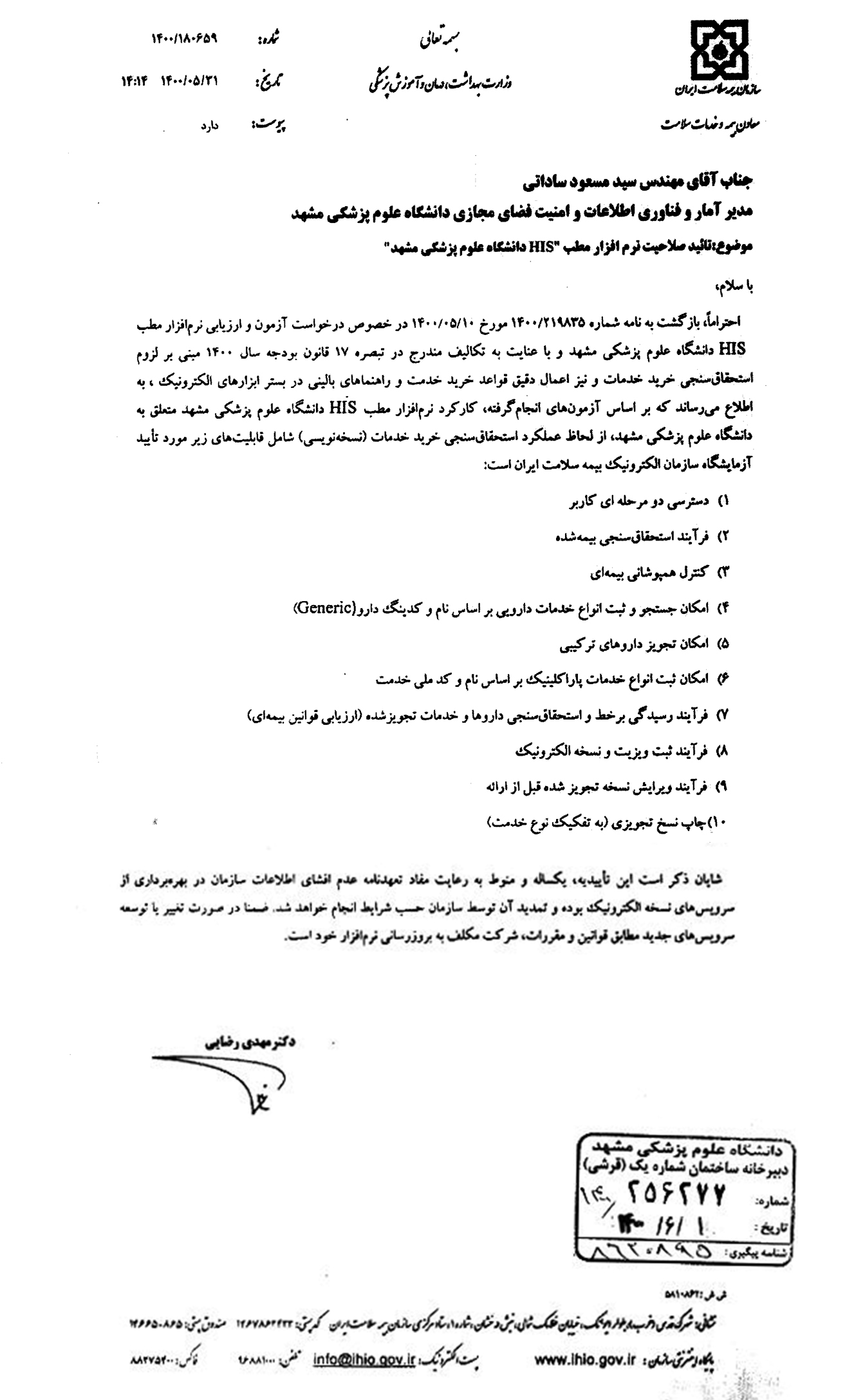 دانشگاه علوم پزشکی مشهد به عنوان اولین دانشگاه علوم پزشکی در سطح کشور موفق به اخذ گواهینامه تایید صلاحیت نرم افزار HIS در قسمت مطب جهت اجرای نسخه نویسی و نسخه پیچی الکترونیک از سازمان بیمه سلامت گردید .