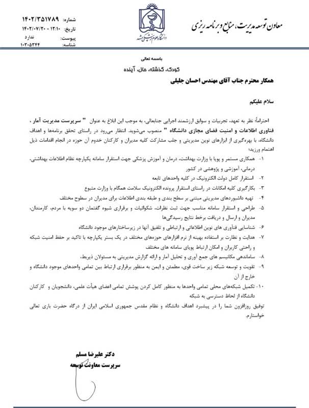 دکتر علیرضا مسلم در این حکم آقای مهندس احسان جلیلی را به عنوان سرپرست مدیریت آمار و فناوری اطلاعات و امنیت فضای مجازی دانشگاه علوم پزشکی مشهد منصوب نموده است.