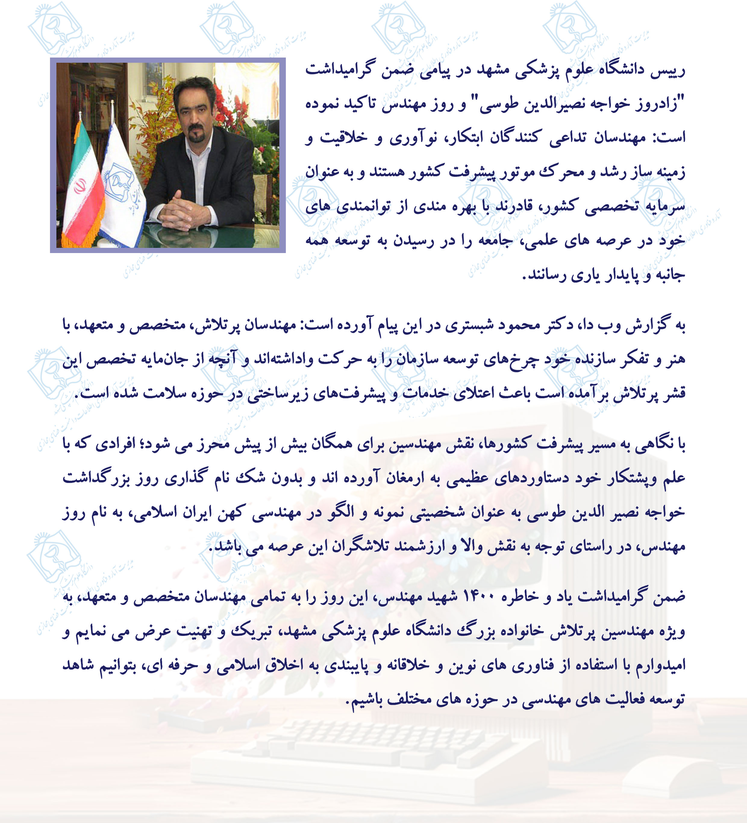 بازدید: 138 امتیاز: ( 1 Rating ) پیام رییس دانشگاه علوم پزشکی مشهد به مناسبت روز مهندس چاپ امتیاز کاربران لطفا رای دهید رای 1 رای 2 رای 3 رای 4 رای 5 قبلی بعدی