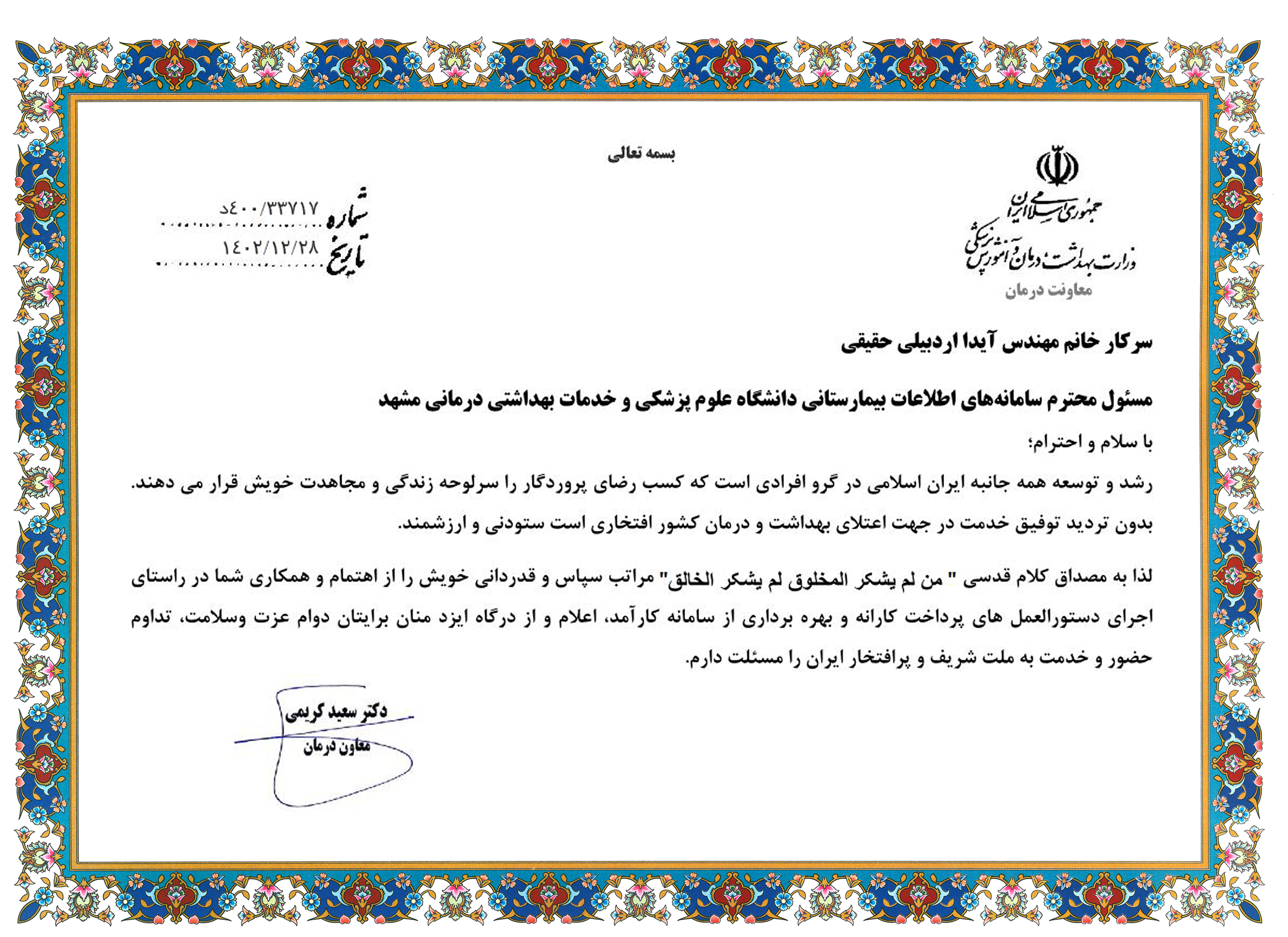 آقای دکتر سعید کریمی، معاون محترم درمان وزارت بهداشت،درمان وآموزش پزشکی، با ارسال تقدیرنامه ای از زحمات مسئول محترم واحد سامانه اطلاعات بیمارستانی (HIS)، سرکار خانم مهندس آیدا اردبیلی حقیقی تقدیر و تشکر نمودند. متن تقدیر نامه به شرح ذیل می باشد: |