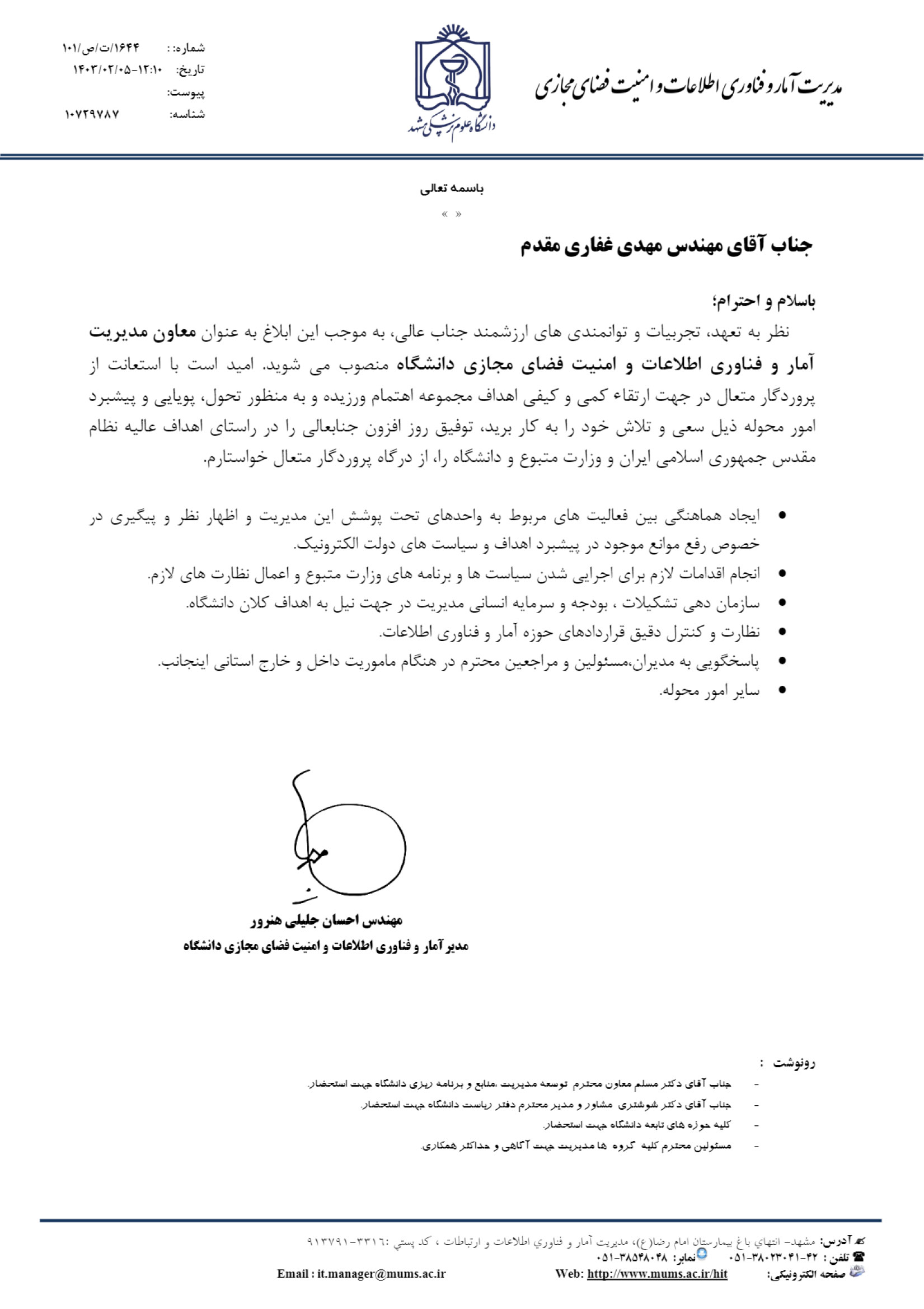 بازدید: 352 امتیاز: ( 0 Rating ) انتصاب معاون مديريت آمار و فناوری اطلاعات و امنيت فضای مجازی چاپ امتیاز کاربران لطفا رای دهید رای 1 رای 2 رای 3 رای 4 رای 5 مدير آمار و فناوری اطلاعات دانشگاه، طی ابلاغی معاون اين مديريت را منصوب کرد. آقای مهندس احسان جليلی، در اين ابلاغ، آقاي مهندس مهدی غفاری مقدم را به عنوان معاون مديريت آمار و فناوری اطلاعات منصوب نموده است. قبلی بعدی