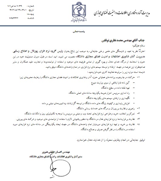 آقای مهندس جليلی، در اين ابلاغ، آقاي مهندس محمد نظری نوقابی را به عنوان رئيس گروه نرم افزار، پورتال و اطلاع رسانی مديريت آمار و فناوری اطلاعات منصوب نموده است.