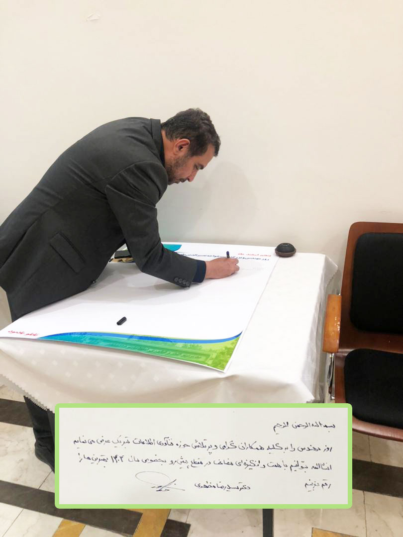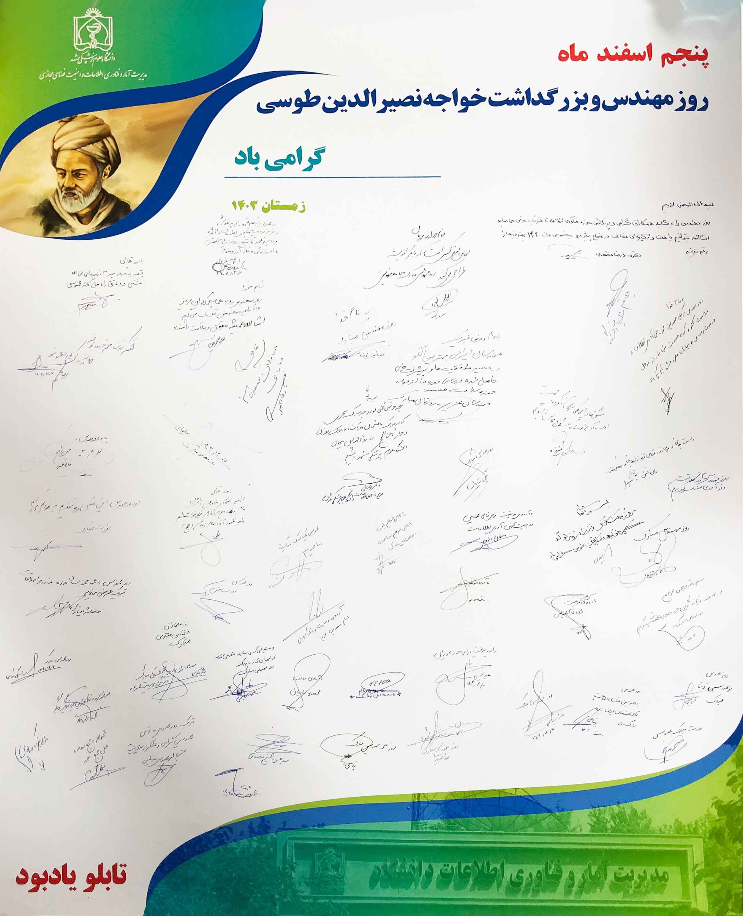 تابلو يادبودي که در اين روز تهيه شده بود توسط آقاي دکتر مظهري و حاضرين در جلسه برسم يادبود امضا شد.