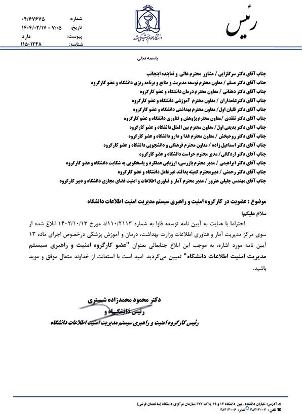 مهندس جلیلی در این خصوص افزود، پیرو ماده 13 آیین نامه توسعه فاوا(ابلاغ شده از سوی مرکز مدیریت آمار و فناوری اطلاعات وزارت بهداشت، درمان و آموزش پزشکی)، با هدف ارتقای ضریب امنیتی فضای تبادل داده ها و امنیت اطلاعات دانشگاه های تابعه وزارت بهداشت، با دستور آقای دکتر شبستری ریاست محترم دانشگاه، کارگروه مذکور تشکیل گردید و ابلاغ به شرح ذیل برای اعضاء محترم صادر گردید.