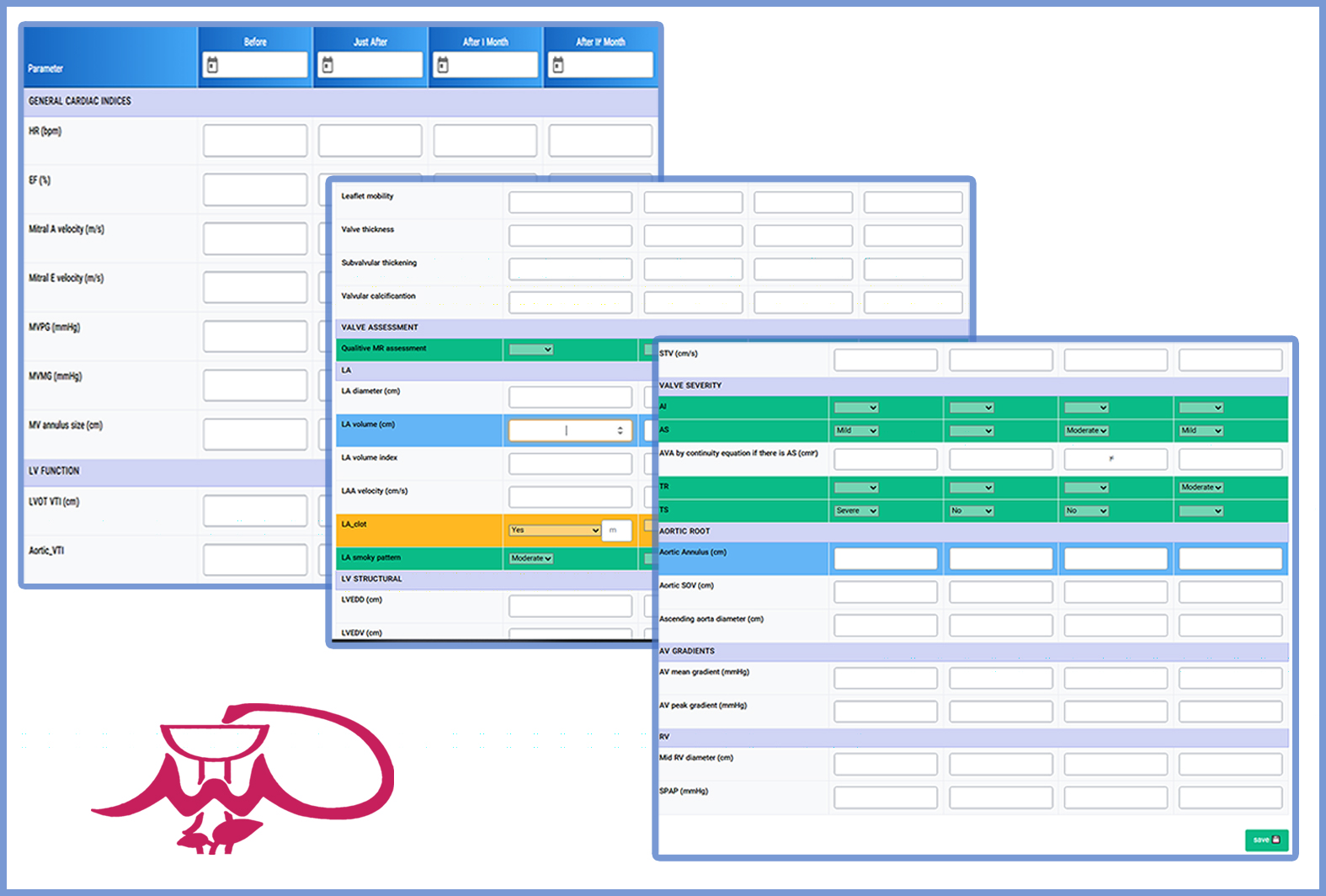 در این ماژول امکان ثبت، ذخیره و مقایسهی دادههای اطلاعات تخصصی اکو، از جمله شاخصهای عملکرد بطن چپ، اندازه دهلیز چپ، وضعیت دریچهها و سایر پارامترهای کلیدی، بهصورت گروهبندیشده و ساختاریافته، برای هر بیمار در بازههای زمانی مختلف فراهم شده است، بدینترتیب، اساتید تیم درمان بیمار میتوانند، روند تغییرات پارامترهای قلبی هر بیمار را در چهار مقطع زمانی(پیش از بالون زدن، بلافاصله پس از بالون زدن، یک ماه پس از بالون زدن، دوازده ماه پس از بالون زدن) را مشاهده و تحلیل نمایند.