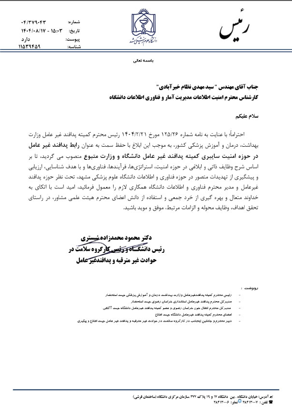 جناب آقای مهندس " سید مهدی نظام خیرآبادی" کارشناس محترم امنیت اطلاعات مدیریت آمار و فناوری اطلاعات دانشگاه سلام عليكم احتراماً؛ با عنایت به نامه شماره 26/125 مورخ 21/2/1404 رئیس محترم کمیته پدافند غیر عامل وزارت بهداشت، درمان و آموزش پزشکی کشور، به موجب این ابلاغ با حفظ سمت به عنوان رابط پدافند غیر عامل در حوزه امنیت سایبری کمیته پدافند غیر عامل دانشگاه و وزارت متبوع منصوب می گردید، تا بر اساس شرح وظایف ذاتی و ابلاغی در حوزه امنیت، استراتژیها، فرآیندها، فناوریها و با هدف شناسایی، ارزیابی و پیشگیری از تهدیدات متصور در حوزه فناوری و اطلاعات دانشگاه علوم پزشکی مشهد، تحت نظر حوزه پدافند غیرعامل و مدیر محترم فناوری و اطلاعات دانشگاه همکاری لازم را معمول فرمائید، امید است با اتکای به خداوند متعال و بهره گیری از خرد جمعی و استفاده از دانش اعضای محترم هیئت علمی مشاور، در راستای تحقق اهداف، وظایف محوله و الزامات مرتبط، موفق و موید باشید. |